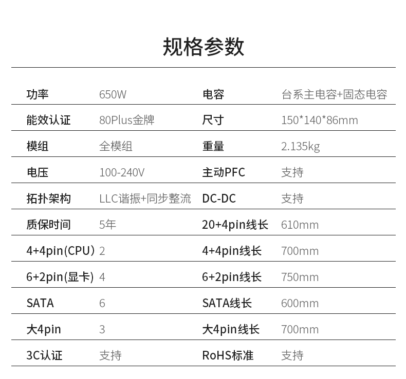 长城X6金牌 额定650W全模电源宽幅单路12V静音台式机电源适用