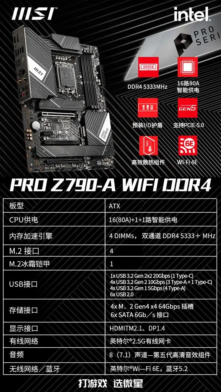 适用于MSI 微星PRO B760M-P DDR4 支持CPU 12代 13代