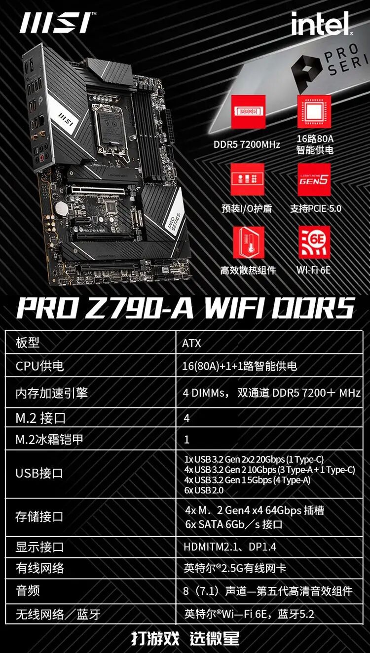 微星PRO Z790-P WIFI DDR5台式机电脑主板适用13600KF/ 13700KF