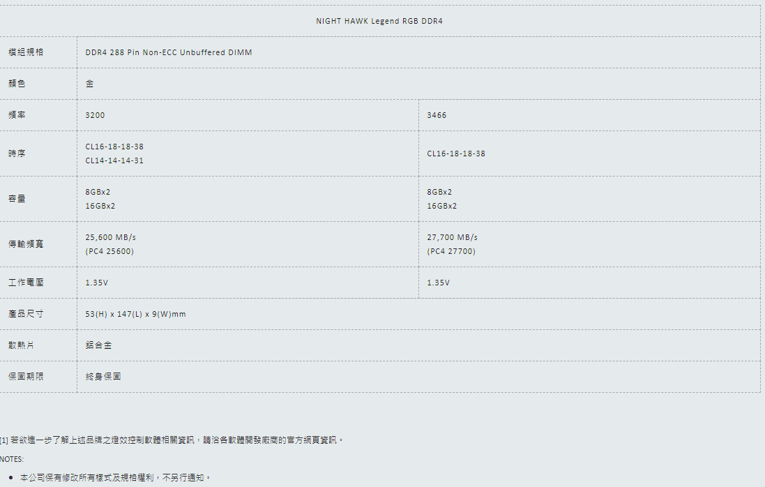 NIGHT HAWK Legend 夜鷹 RGB DDR4 桌上型記憶體4000 3600 3200
