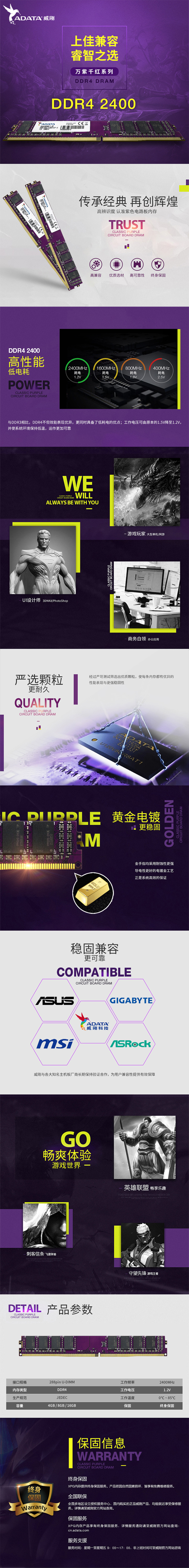 适用威刚万紫千红4G DDR4 2400/2666/3200台式机内存条4GB适用于