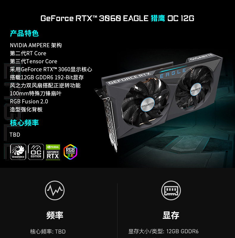适用技嘉RTX3060 EAGLE OC 12G猎鹰电竞游戏电脑独立显卡